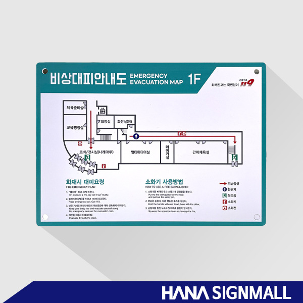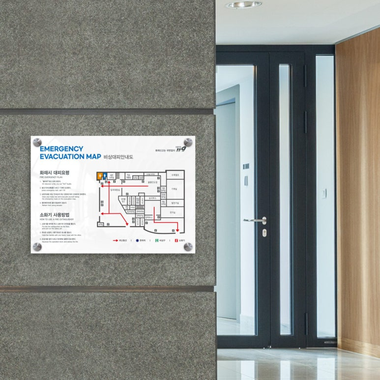 위 피난안내도는 다보 타입으로 제작되어, 사진처럼 벽면에 깔끔하게 고정할 수 있는 제품입니다~ 🙂